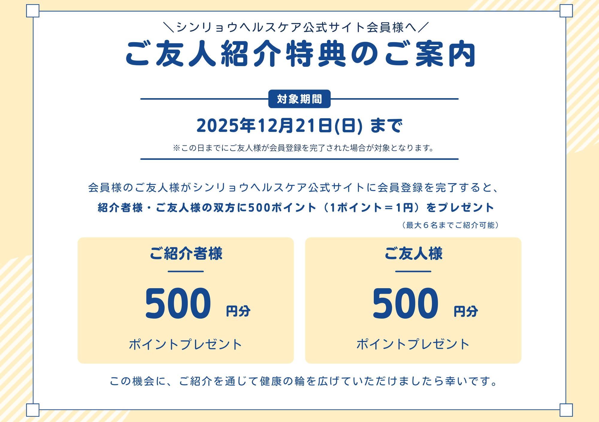 【キャンペーンのポイント】 ・会員様のご友人がShinryoHealthcare公式サイトに会員登録いただくと、双方に500ポイントをプレゼント! ・紹介された方は「ご友人紹介特典ポイント」に加えて、通常の「新規会員登録ポイント」もW付与でお得! ・お得なポイントは、高濃度水素ゼリーの初回のご購入からご利用いただけます。 ・期間限定ですので、この機会にぜひご利用ください!
